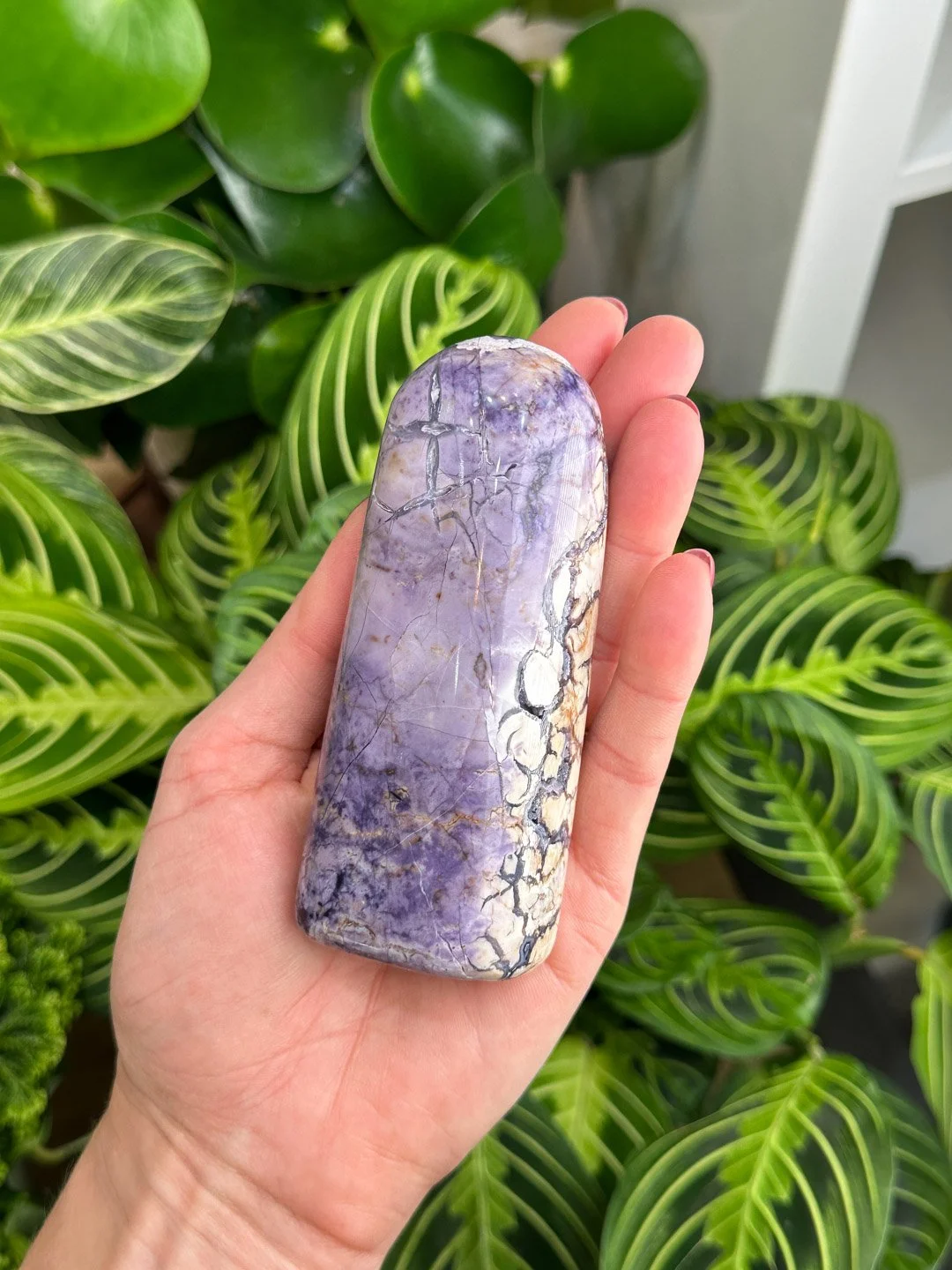 This rare, gorgeous Tiffany Stone freeform has an aesthetic look as half of it holds a whimsical light purple tone that blends into the other side with stunning Chalcedony veining that creates beautiful patterns that turn from purple to an earthy off white tone. This piece is self standing so it displays beautifully and adds a dreamy essence to any collection. Tiffany Stone only comes from one small location in Utah, USA and no new material has come out in many years. The pieces we have available are old stock material that have been saved for years and polished only recently, so this is a special treat to have them and we hope you love the selection!